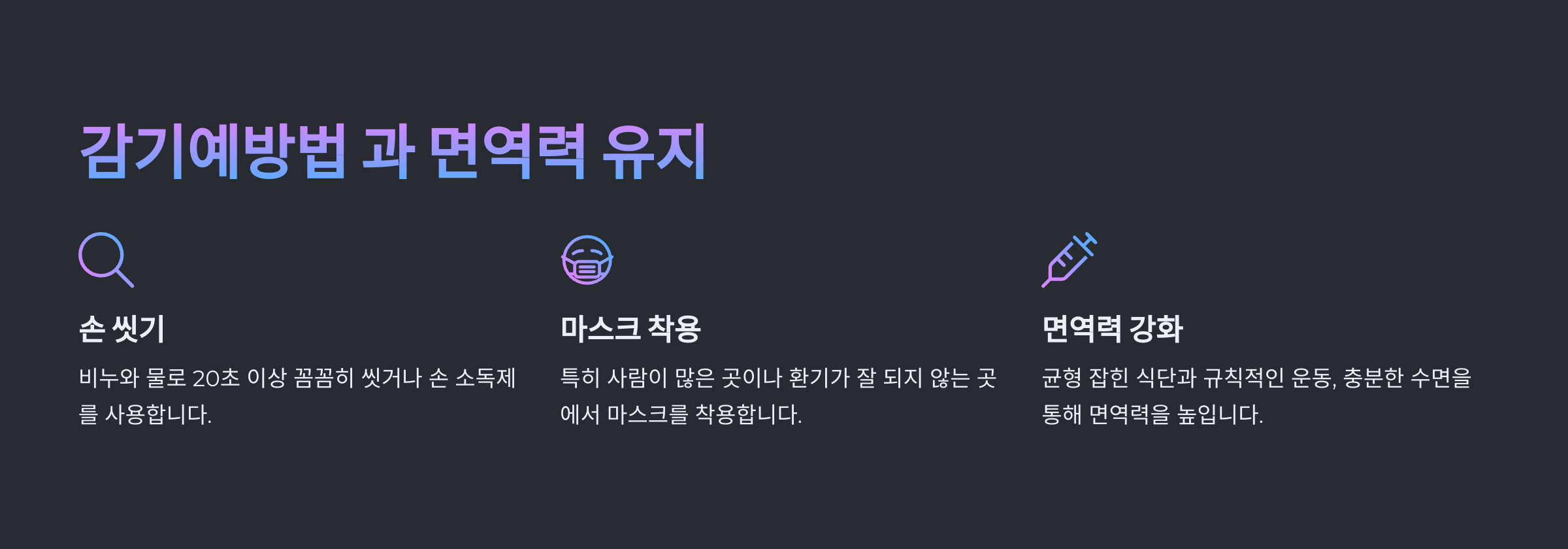 손을 자주 씻고(손소독), 적절한 운동과 균형 잡힌 식단을 유지하세요. 스트레스를 줄이고 충분한 비타민D 섭취도 면역력 강화에 도움이 됩니다.