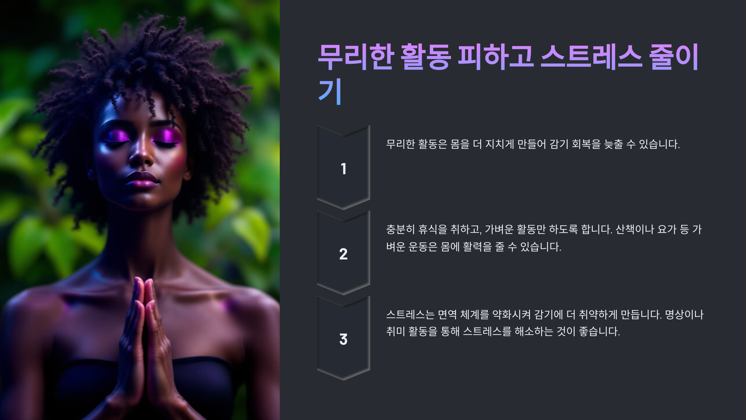 스트레스는 면역력을 약화시키는 주요 원인 중 하나입니다. 감기에 걸렸을 때는 무리한 운동이나 과로를 피하고, 명상이나 가벼운 요가로 몸과 마음을 편안하게 해주세요.