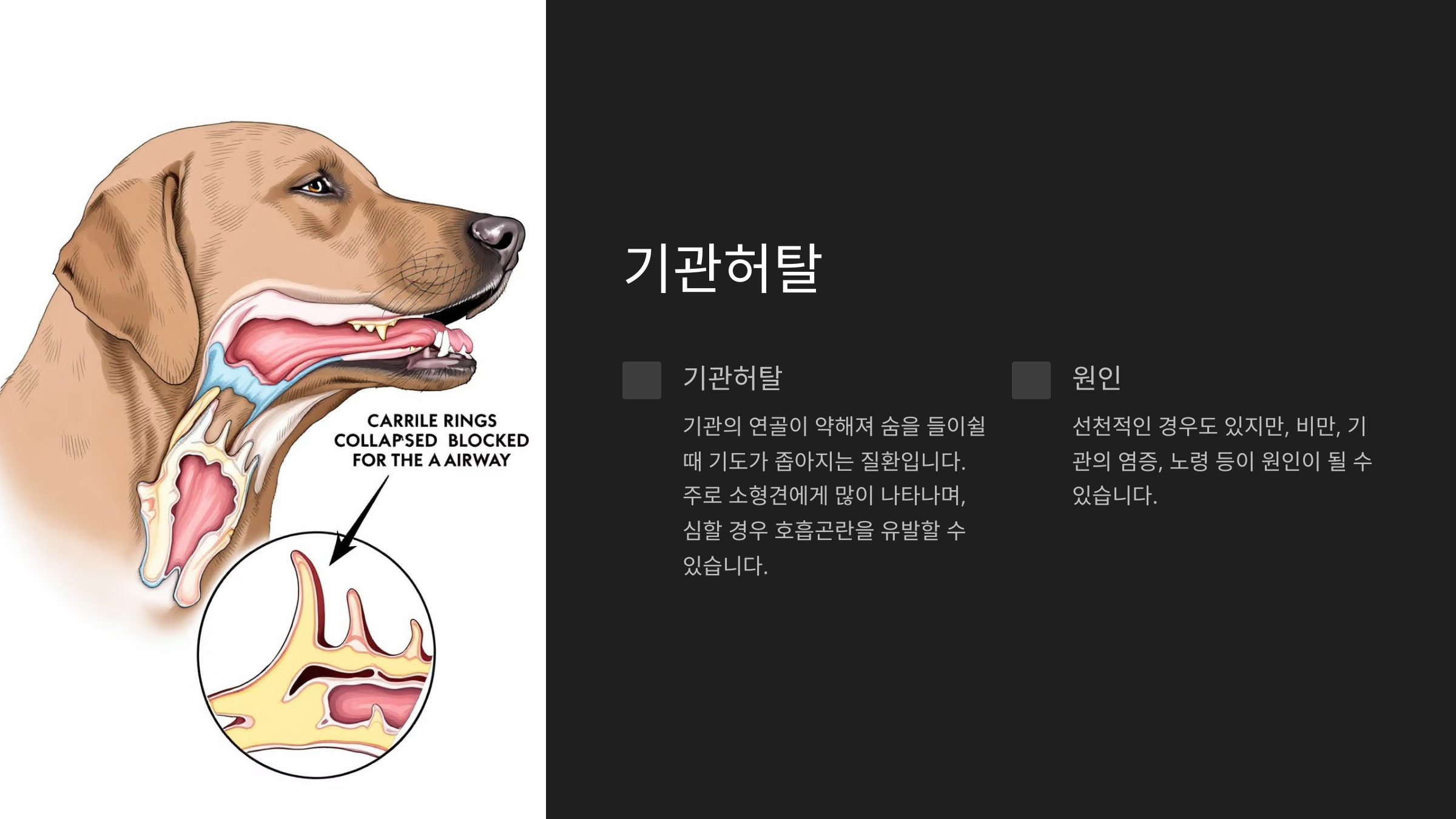 기관허탈이란 기도가 무너지는 질환으로, 특히 소형견(요크셔테리어, 포메라니안 등)에서 자주 발생합니다.