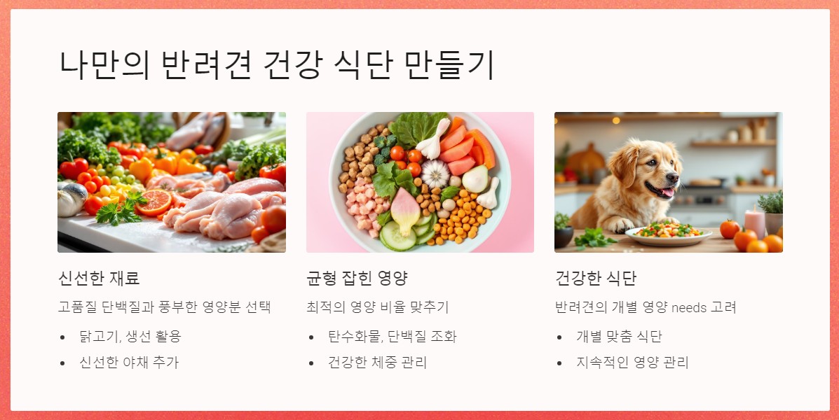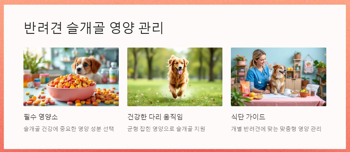 | 칼슘 & 비타민D | 뼈를 튼튼하게 하고 슬개골 보호 | 치즈, 달걀, 멸치 |