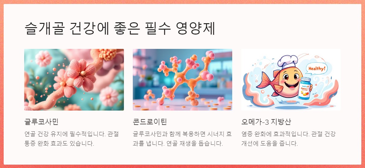 | 글루코사민 & 콘드로이틴 | 연골을 보호하고 관절 기능을 개선해 줌 | 연어, 닭발, 관절 영양제 |