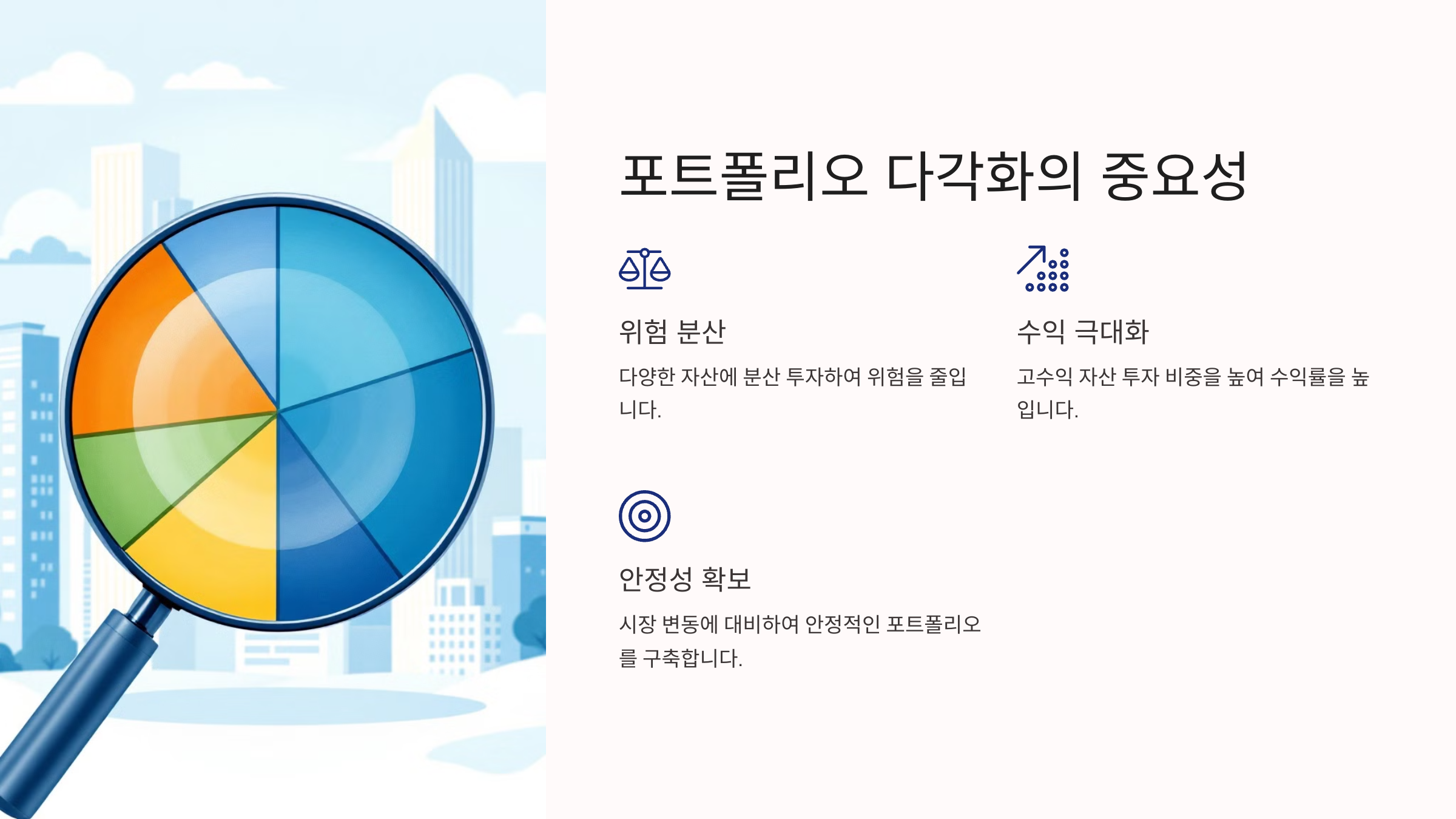 한 종류의 자산에만 투자하는 것보다 여러 종류의 자산에 분산 투자하는 것이 위험을 줄일 수 있습니다. 주식, 채권, 부동산 등 다양한 자산에 분산 투자하여 포트폴리오를 구성하는 것이 좋습니다.