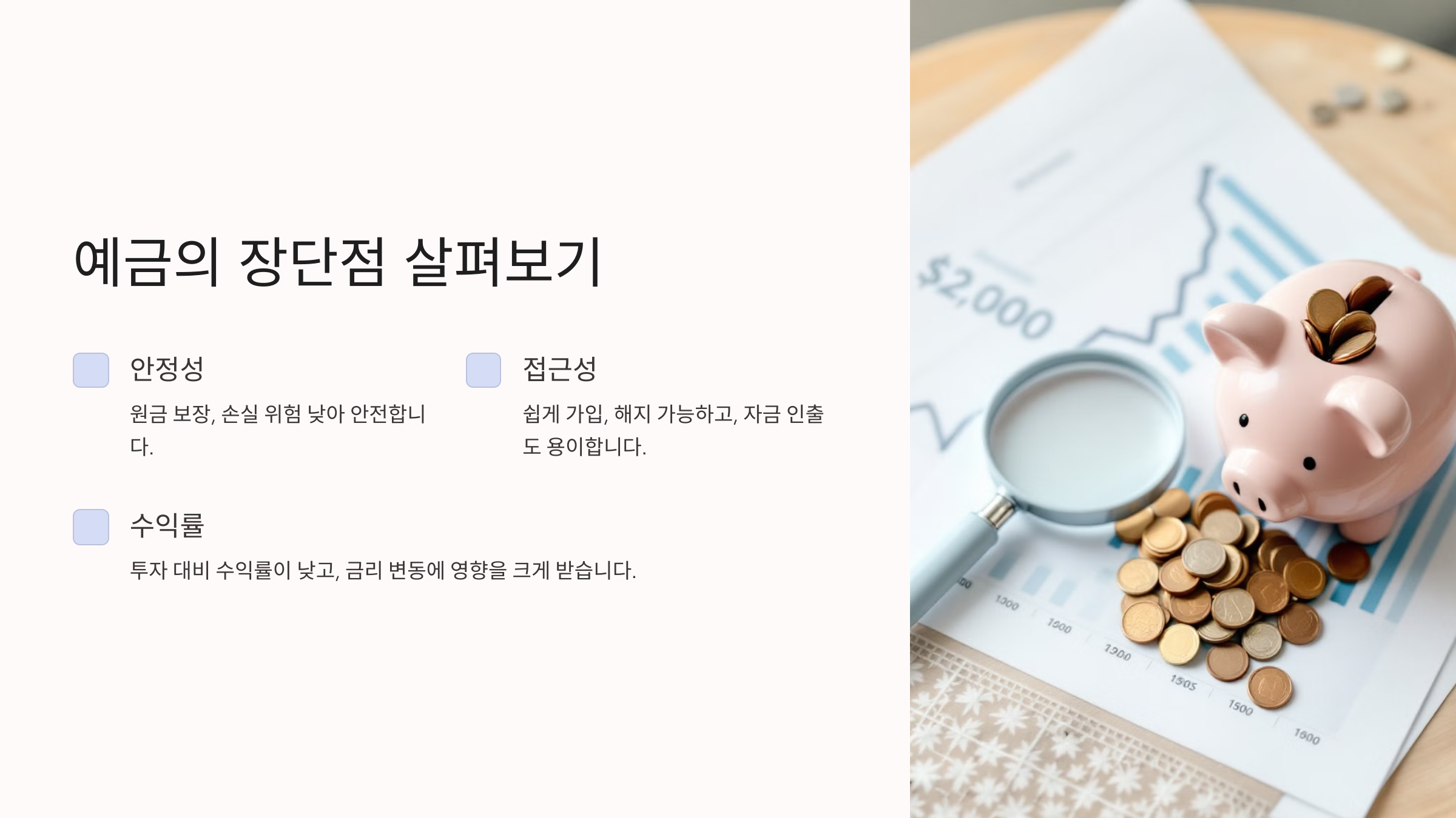 - 낮은 위험: 예금은 투자에 비해 위험이 낮아 안정적인 수익을 원하는 분들에게 적합합니다.