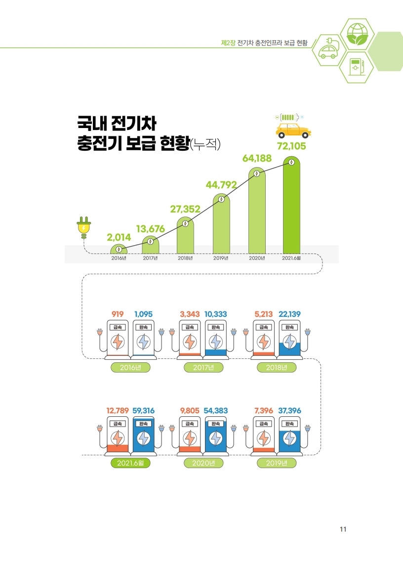 전기차 충전기는 전기차 보급 확대에 발맞춰 ’21.6월 기준 누적 급속 충전기 1.2만기, 완속 충전기 5.9만기가