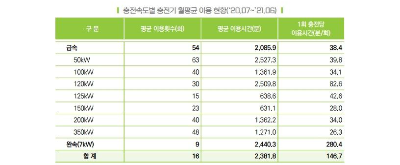 1회 충전당 이용시간은 급속 평균 38분, 완속 평균 4시간 40분의 이용시간을 보인다.