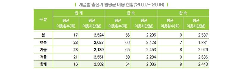 사계절 중 월평균 이용시간은 겨울과 봄이 2,551분, 2,524분으로 높으며, 급·완속을 나누어 살펴보면 급