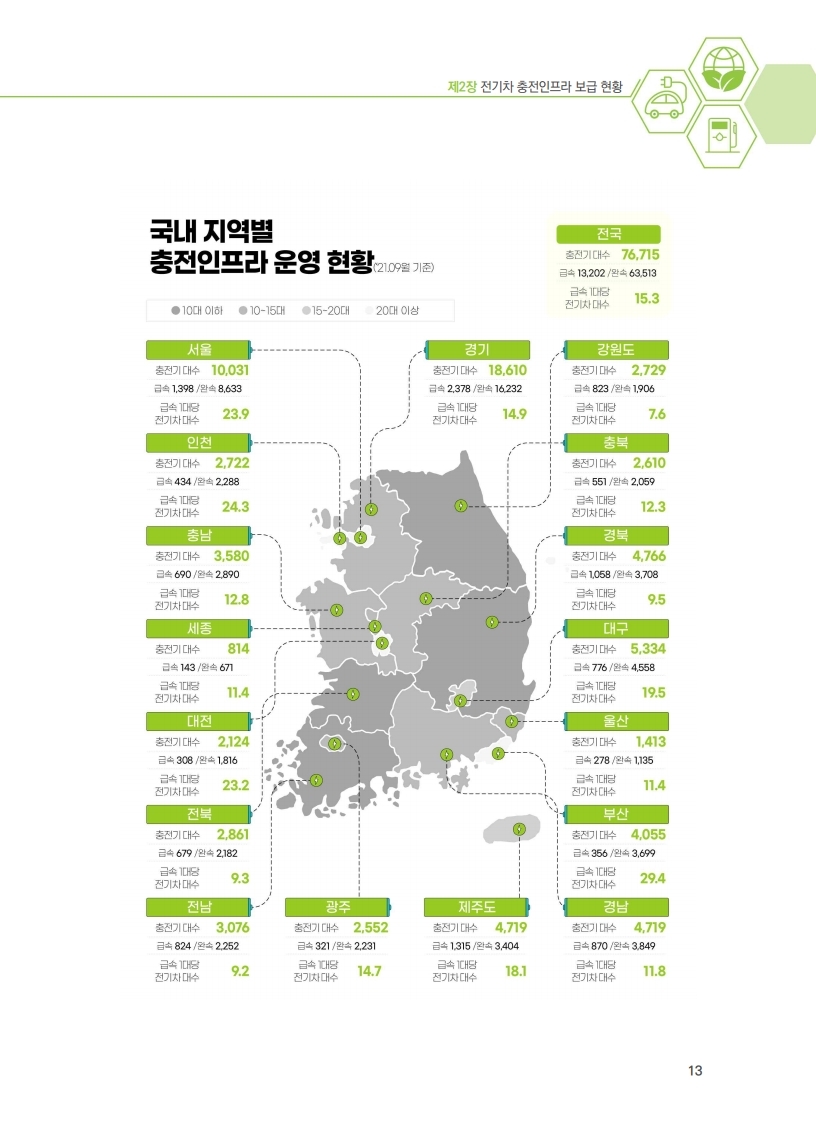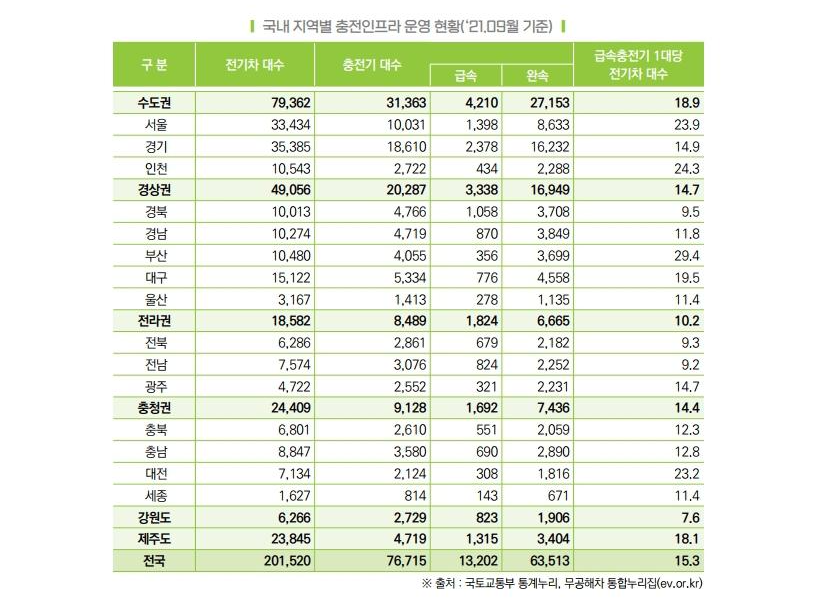 순이며, 보급률이 높은 지역은 강원(7.6대), 전남(9.2대), 전북(9.3대), 경북(9.5대) 순이다. 대체적으로 전기차