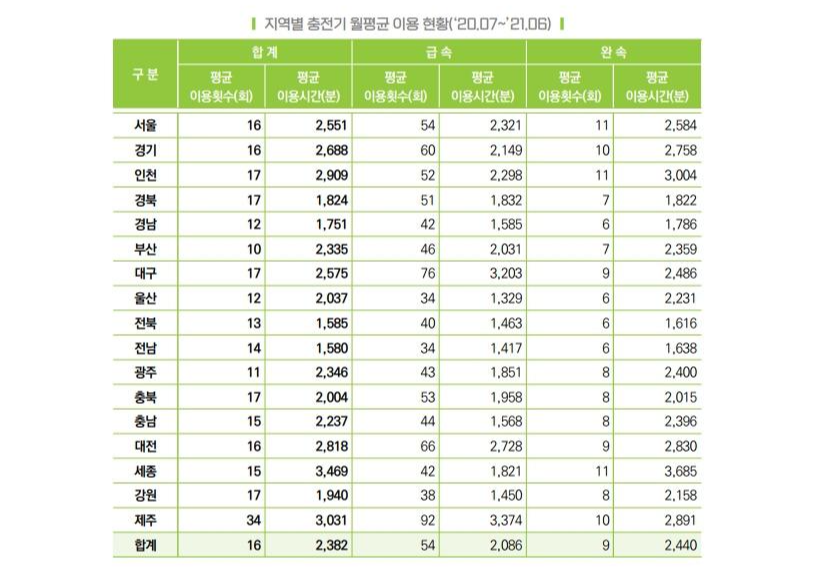 관광객이 많은 지역의 특성상 급속 충전기의 월평균 이용횟수가 92회로 가장 높기 때문이다. 제주도는