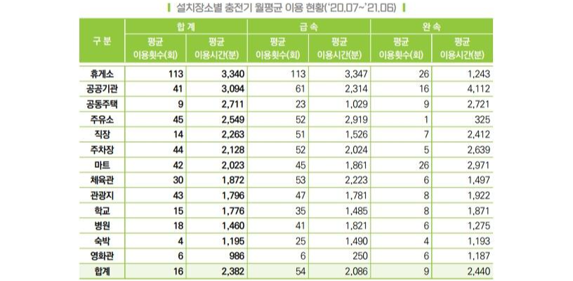 관광지, 주요소에 비해서도 2배 이상 높은 횟수를 기록하였다. 장거리 운행을 하는 전기차들이 휴게소의 충전