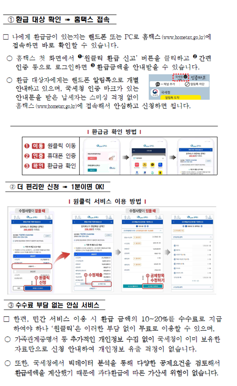국세청은 최근 홈택스를 통해 ‘원클릭 세금 환급’ 기능을 도입했습니다. 이 기능은 종합소득세를 신고한 납세자들이 별도의 서류 제출 없이 지난 5년간 환급받지 못한 세금을 자동으로 신청할 수 있도록 도와줍니다.
