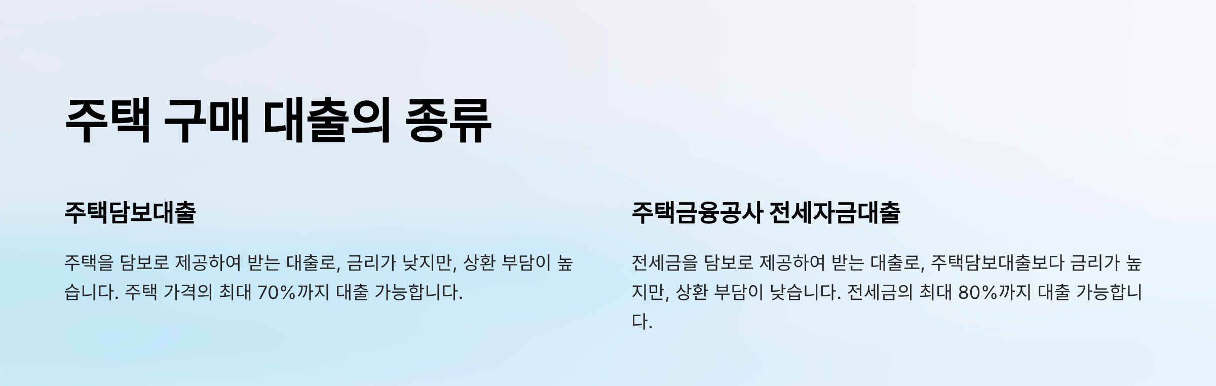 - 특징: 생애 최초 주택 구입자를 위한 낮은 금리 대출