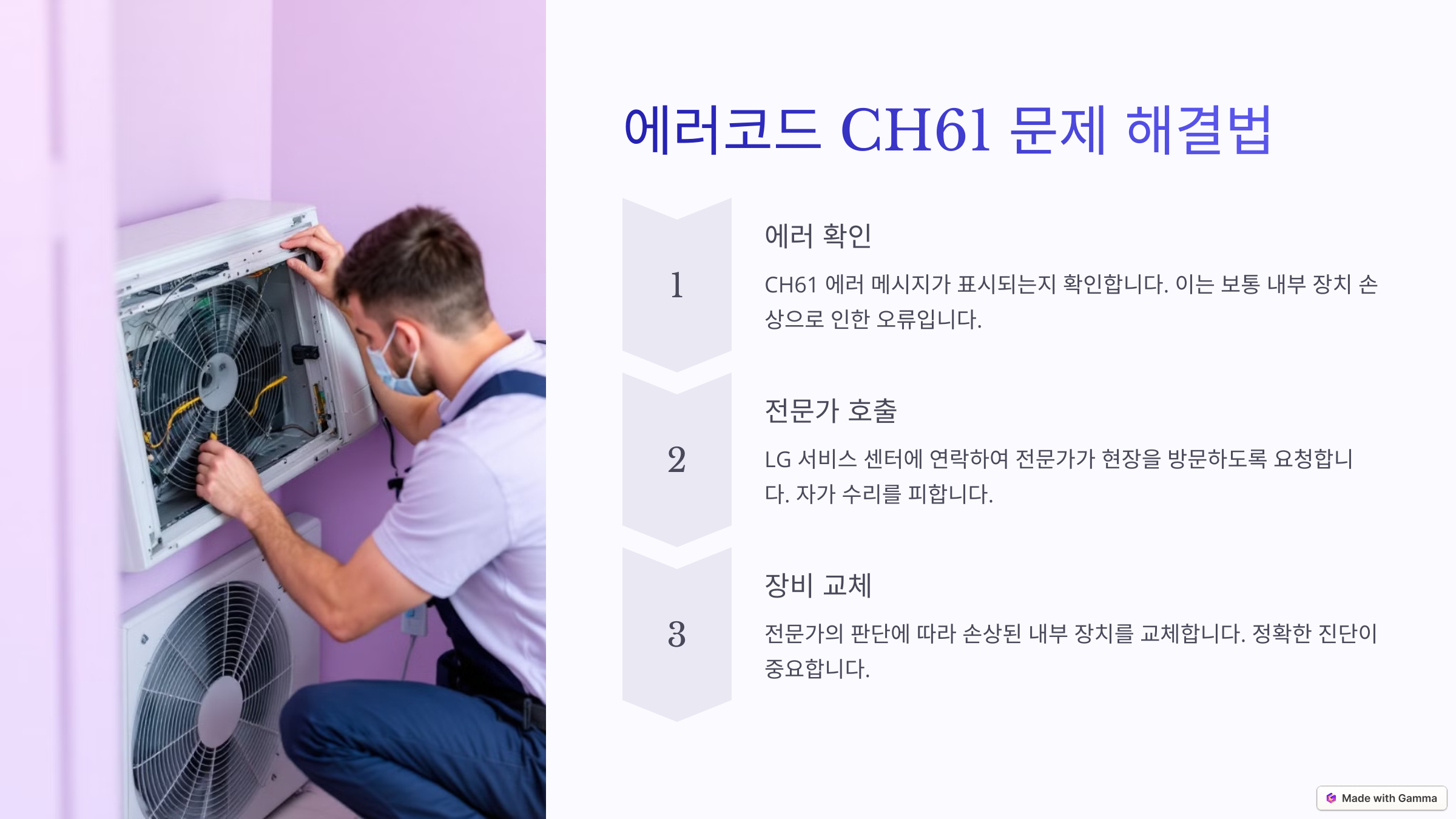 | CH61 | 실내기 배수 오류 | 배수 호스 확인 및 청소필요 | 바로가기 |