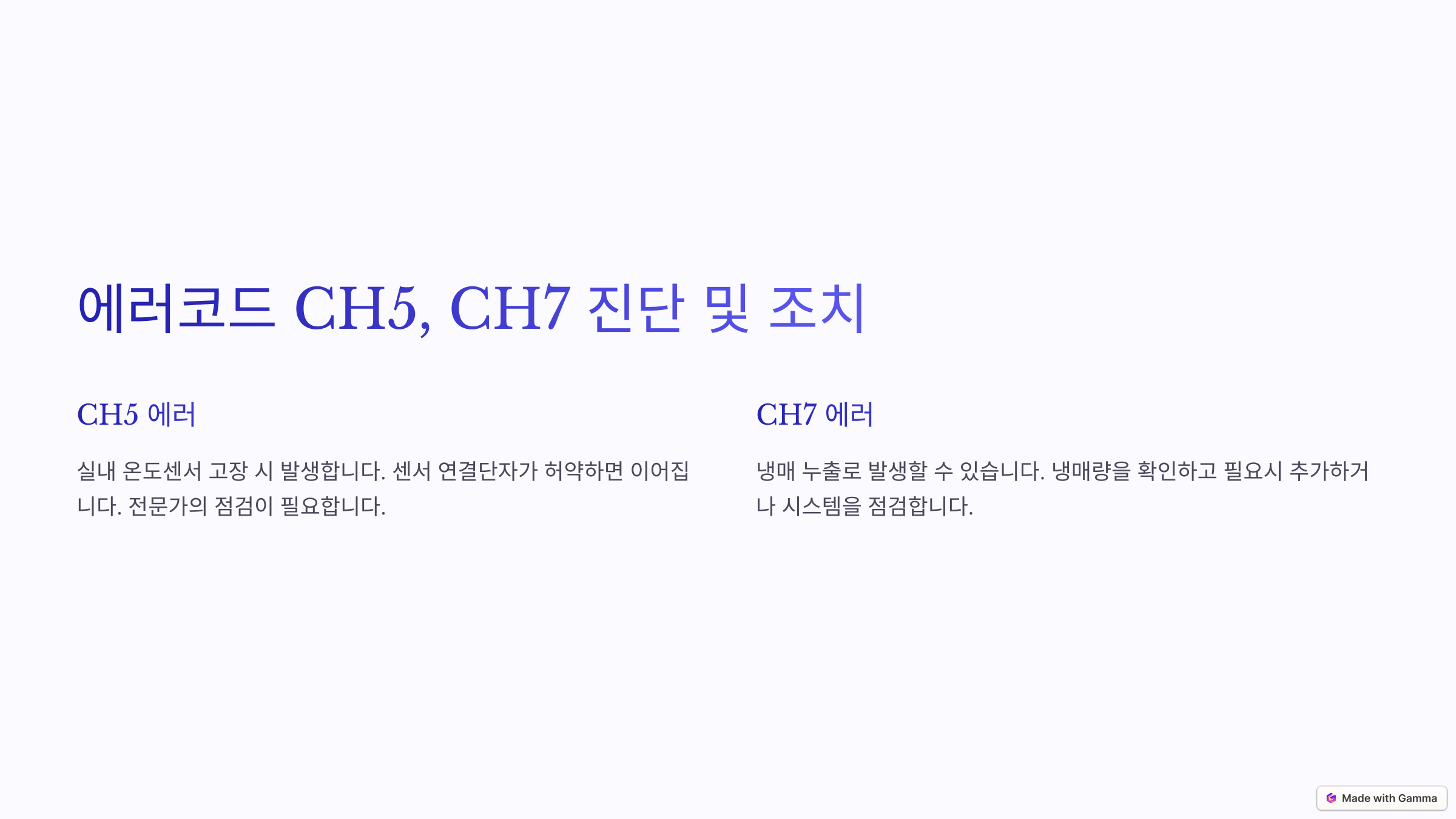 | CH07 | 실내기-실외기 통신 이상 | 배선 점검 및 리셋 | 바로가기 |